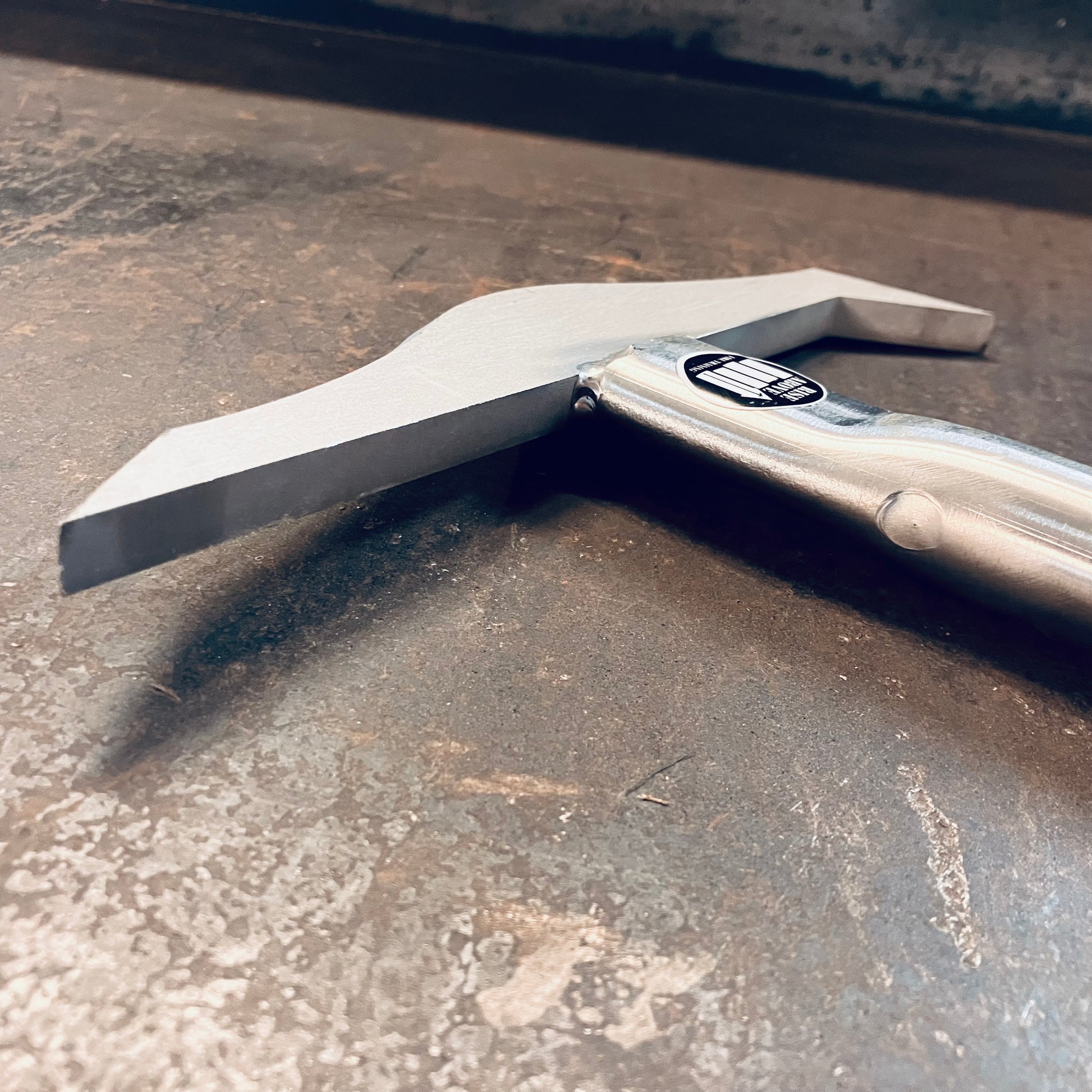 The D-tip is easily cupped or gripped maximizing the ideal 5ft length and reducing shoulder fatigue. The broad edge gives direct solid feedback when sounding the roof and functions as an in-line axe when needed for breaking boards from the top side. The angled edges keep the tool from getting hung up on joists or rafters. The D-tip also easily slides under roofing material allowing the wide face to scrape and pry it loose.