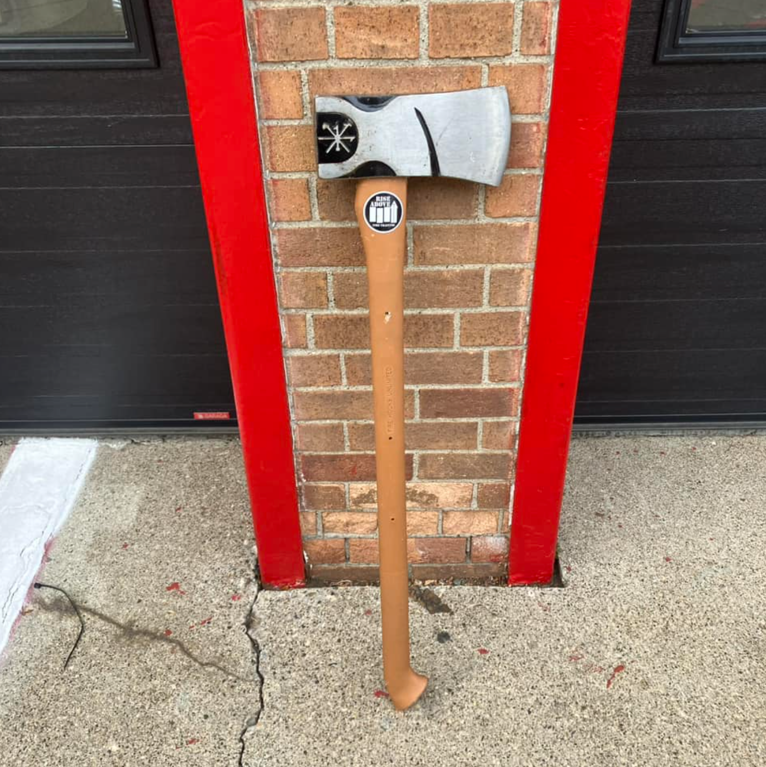 This is a gently used LS8 axe with a head style that Fire Hooks Unlimited experimented with for about a year. They discontinued them because with hard use the logos on either side of the axe would fall off. It really didn't affect the balance or the usage at all, but it wasn't a strong selling point, so they went back to the plain all-silver style that we all know and love.